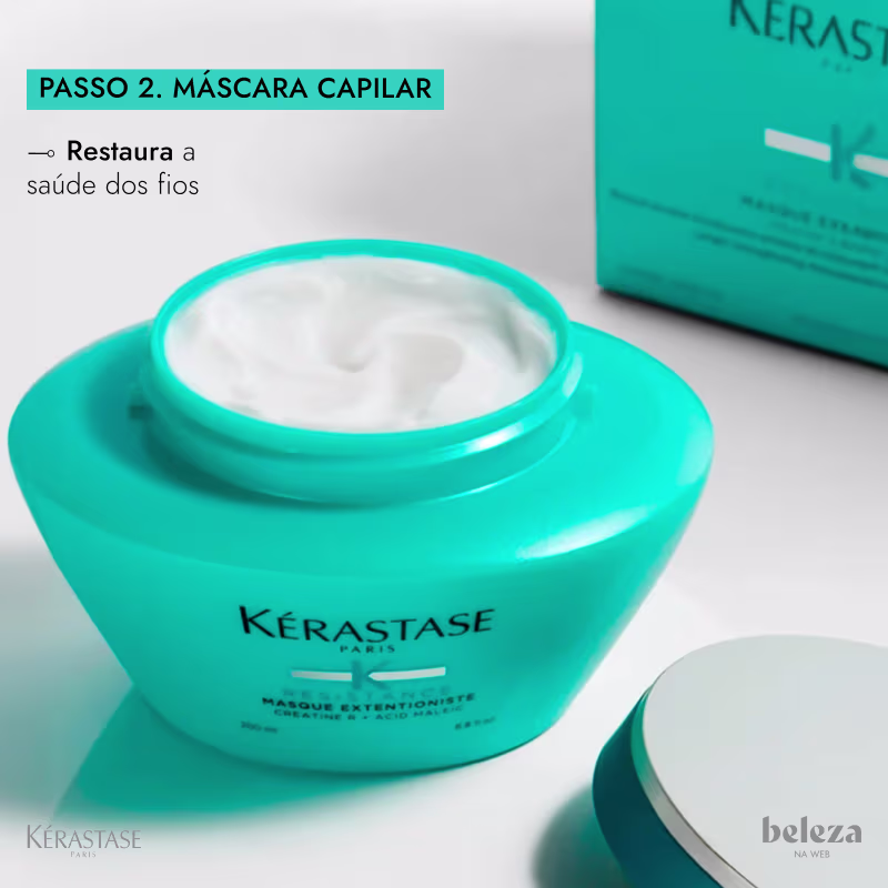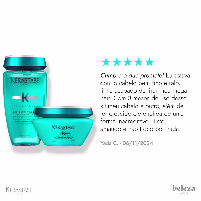 Kit Kérastase Résistance Extentioniste Bain Masque estimula no couro cabeludo ao mesmo em que reconstrói e sela a fibra capilar para proporcionar resistência, brilho e toque sedoso. Assim, consegue garantir um tratamento ideal aos fios, que ficam mais resistentes, perfeitos para um crescimento fortificado.
