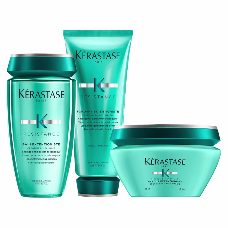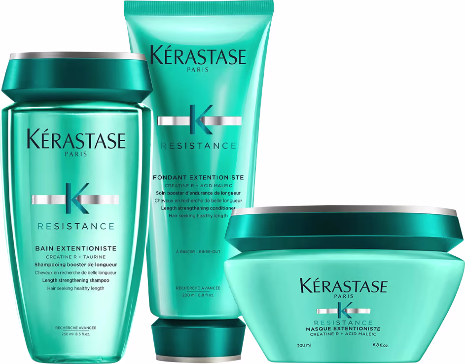 Kit com shampoo, condicionador e máscara para cabelos danificados. Kérastase Résistance Extentioniste Triplo restaura e fortalece o fio enquanto estimula o crescimento saudável, livre de quebras ou ponta duplas.