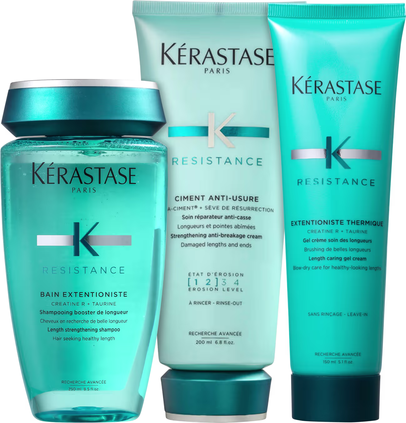Kit com shampoo, condicionador e protetor térmico para cabelos danificados. Kérastase Résistance Trio de Proteção repara, protege e reconstrói.