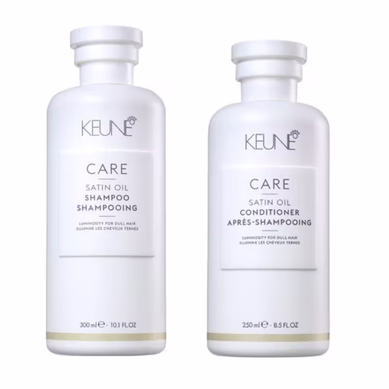 Kit com shampoo e condicionador para cabelos ressecados. Keune Care Satin Oil Dupla Diária conserva os fios hidratados, macios e brilhantes.