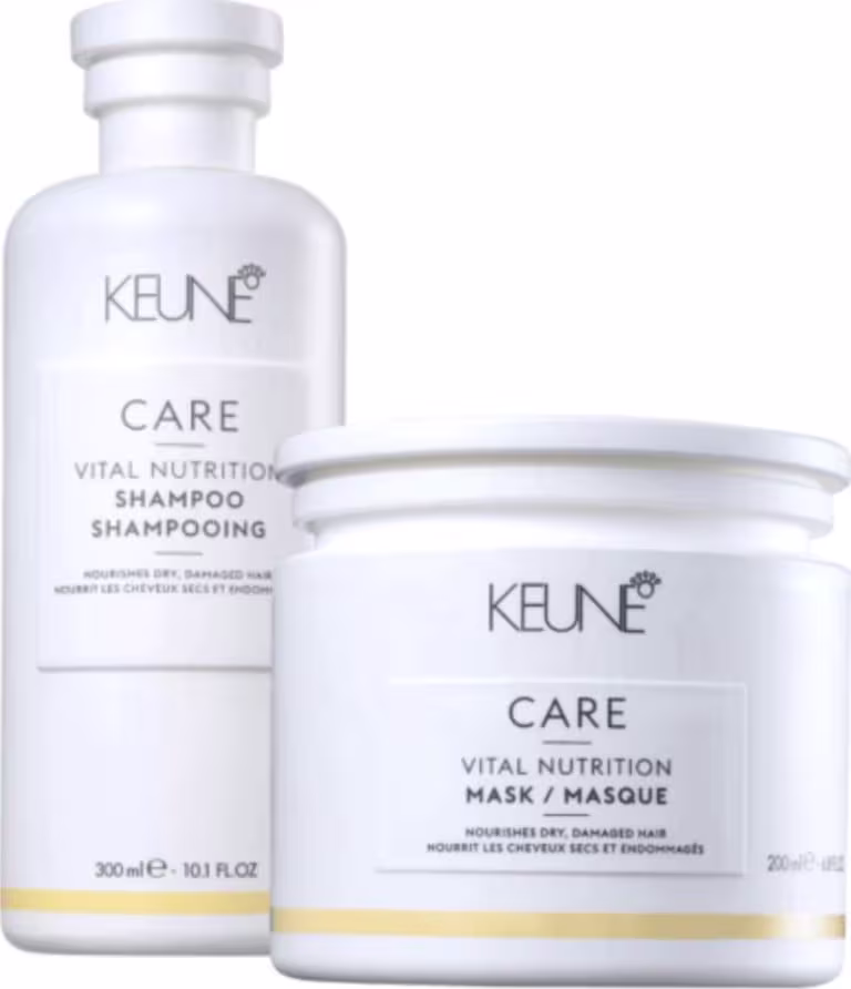 Kit com shampoo e máscara capilar para cabelos secos, porosos e danificados. Keune Care Vital Nutrition Duo de Tratamento devolve maciez, brilho e vitalidade aos cabelos.