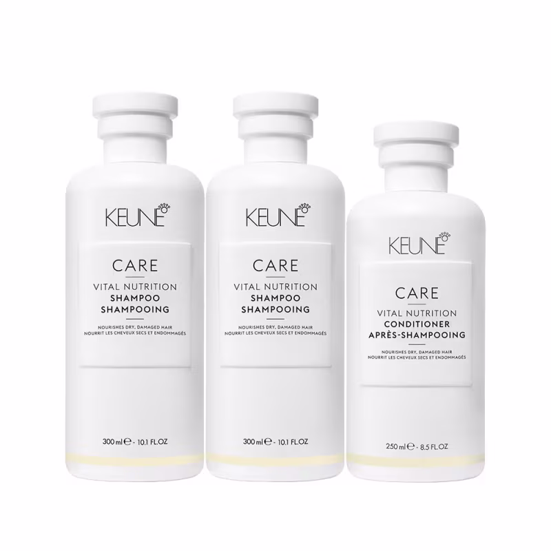 Não sei o CEPKit com shampoo e condicionador para cabelos secos e danificados. Keune Care Vital Nutrition Shampoo Double Trio proporciona hidratação completa.