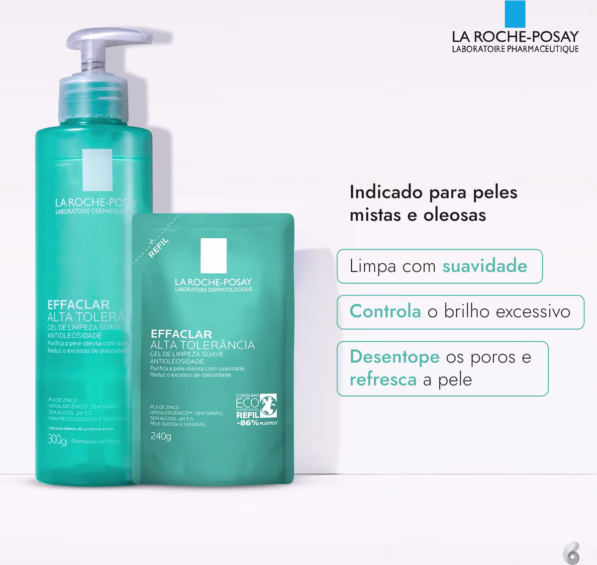 La Roche-Posay Effaclar Alta Tolerância Refil - Gel de Limpeza Facial 240g: controla a produção de sebo excessiva e limpa com suavidade.