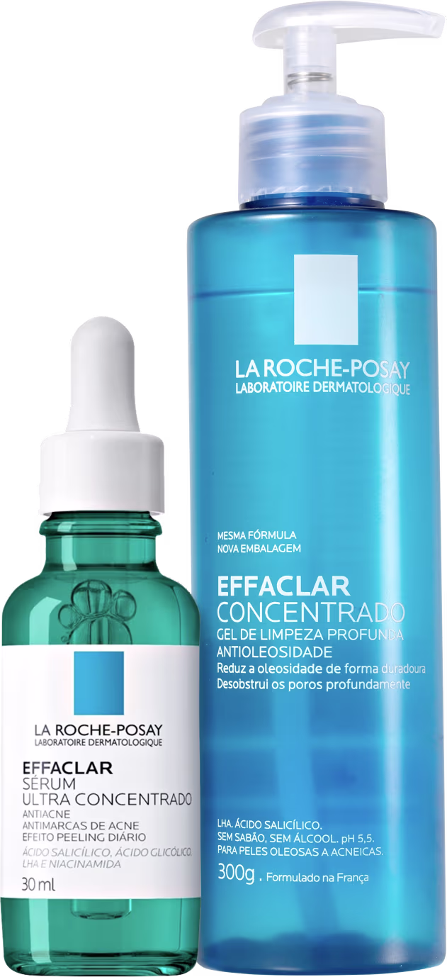 Kit com sérum antiacne e gel de limpeza facial para peles mistas e oleosas.O La Roche-Posay Effaclar Concentrado Duplo auxilia na redução da acne e também melhora o aspecto de manchas e da textura da pele.