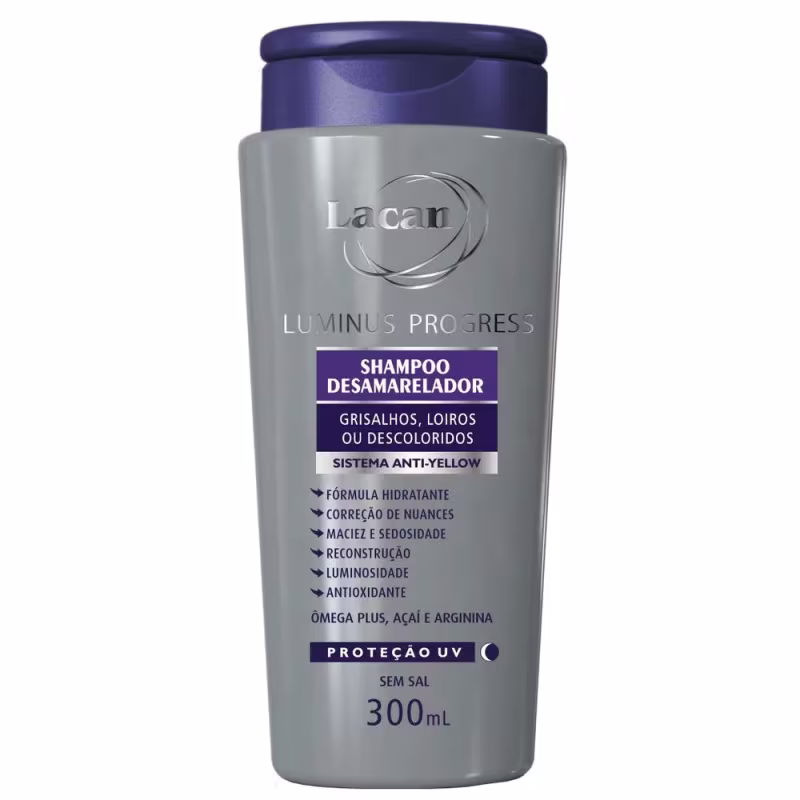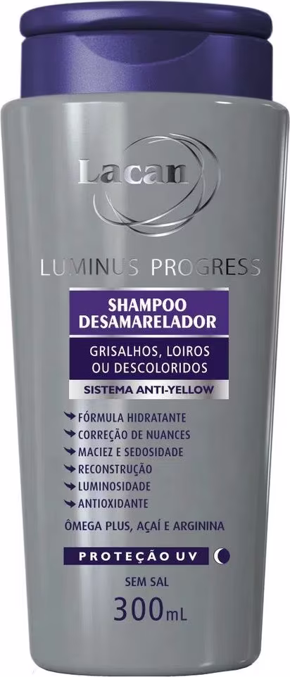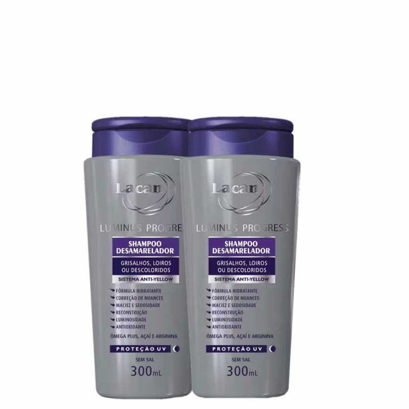 Não sei o CEPKit com dois shampoos desamareladores para cabelos loiros e grisalhos. Kit Lacan Luminus Progress - Shampoo Desamarelador higieniza os fios e corrige nuances, intensificando o tom e prevenindo o alaranjado.