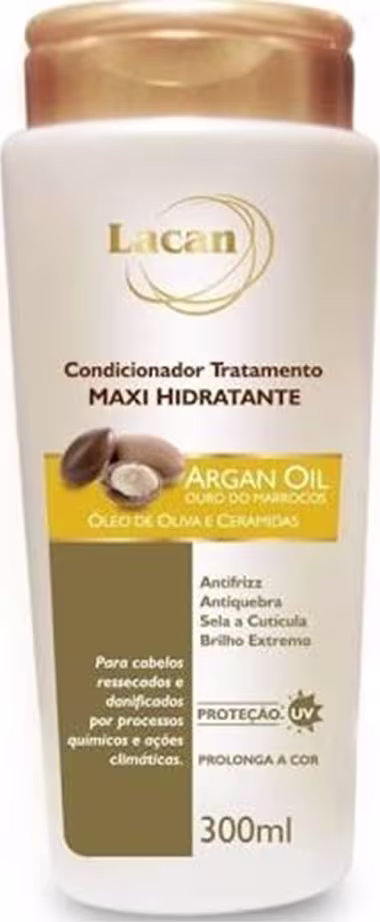 Lacan Maxi Hidratante Argan Oil - Condicionador 300ml: hidratação profunda e prolongada aos fios. Reforço da película protetora que promove ação antiquebra, antifrizz, redução do volume e brilho intenso.