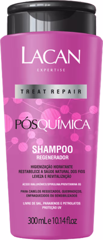 Lacan Treat Repair Pós Química - Shampoo 300ml: regenera os fios fragilizados, deixando-os nutridos, disciplinados, emolientes e com movimento natural.