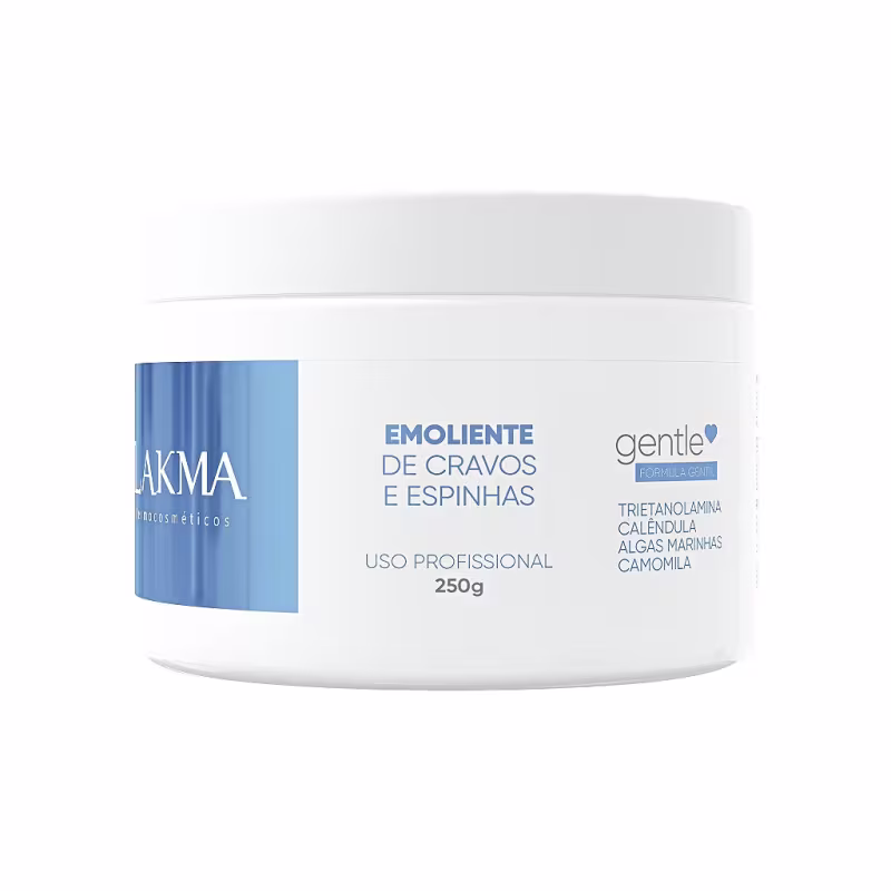 Lakma - Emoliente de Cravos 250g: Indicado para realizar emoliência de cravos e espinhas antes da extração mecânica da limpeza de pele. Recomendamos, para uma maior eficácia, associar o creme ao uso de vapor de ozônio ou máscara térmica. Ativos: Trietanolamina, Calêndula, Algas Marinhas e Camomila.