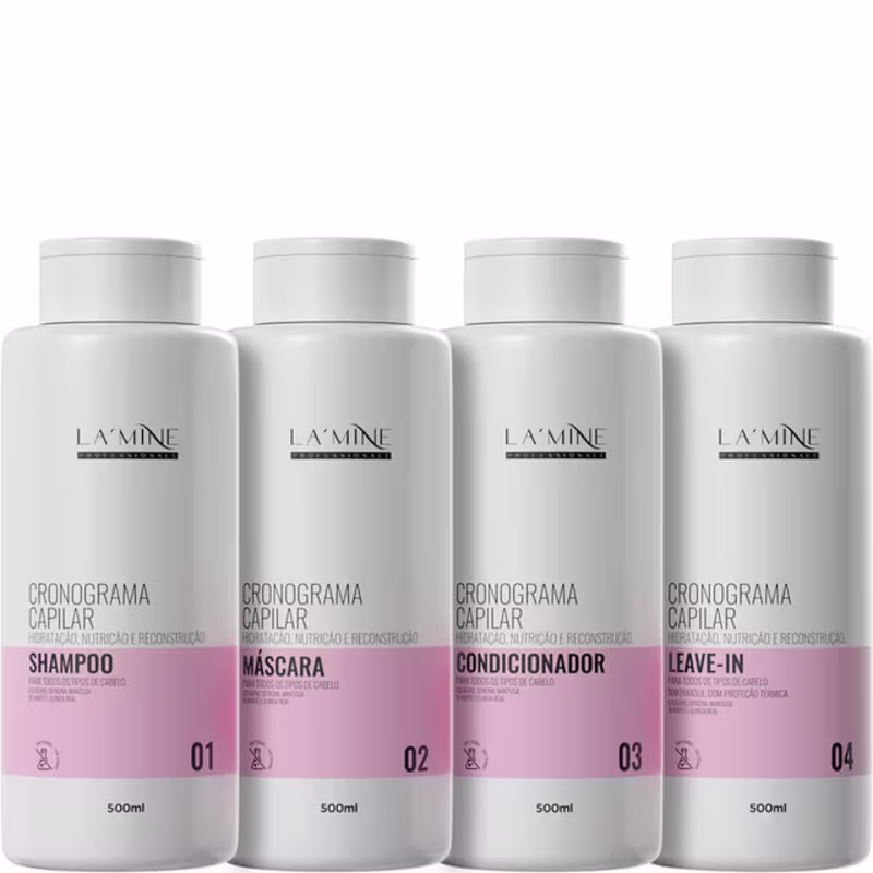 Kit de produtos para todos os tipos de cabelos. La'Mine Cronograma Capilar traz saúde, vida e muita beleza para as suas madeixas. Você terá, em mãos, todos os itens para conseguir os cabelos dos seus sonhos. Os produtos proporcionam resultados de salão em casa logo no primeiro uso.
