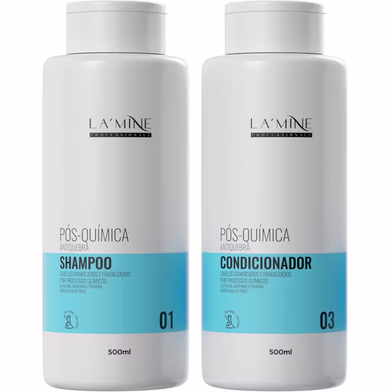 O Kit La'Mine Pós-Química traz os itens da linha Pós-Química, desenvolvida especialmente para cabelos danificados e fragilizados por conta dos processos químicos. Os produtos são ricos em proteínas e ativos que penetram no córtex e nas camadas das cutículas, protegendo e recuperando os cabelos.