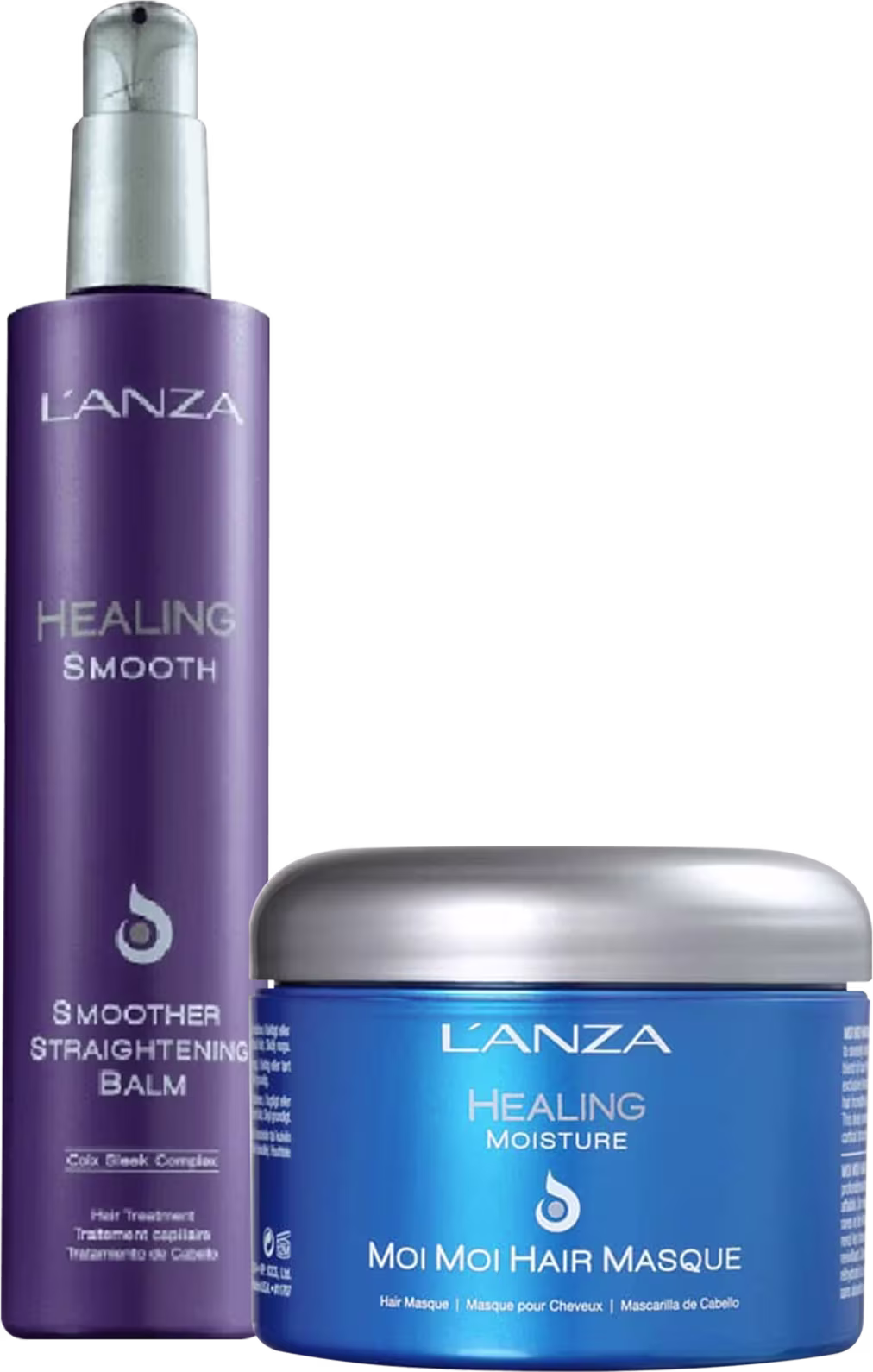 Kit com máscara capilar e bálsamo alisador. L'Anza Healing Moisture Healing Smooth Straightening hidrata e recupera a maciez e a elasticidade dos fios, além de relaxar os cachos e alisar os fios ondulados sob a ação do calor.