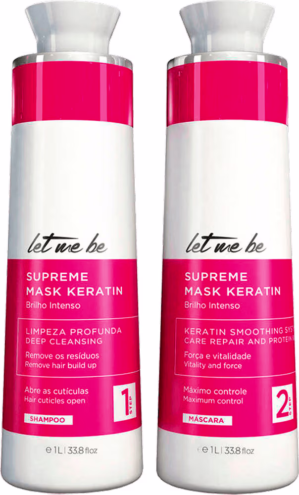 Kit com shampoo e máscara capilar. Let Me Be Supreme Mask Keratin Duo higieniza os fios, repara e reestrutura a fibra capilar.
