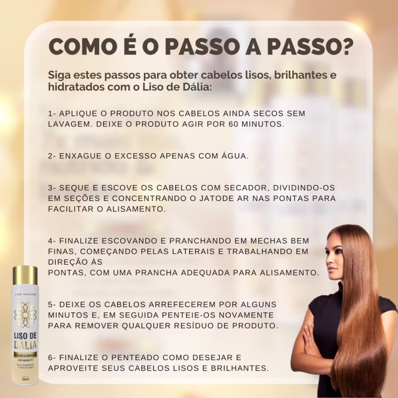 A Liso de Dália é a solução para quem busca cabelos lisos e sedosos, desenvolvida com a a tecnologia de ponta e ingredientes de alta qualidade, oferecendo resultados duradouros, mantendo o cabelo liso e sedosos por meses. Escolher a Progressiva Liso de Dália é para quem busca uma progressiva que vai além do comum. Seus cabelos nunca mais serão os mesmos, e você vai se perguntar como viveu tanto tempo sem essa maravilha em um frasco. Prepare-se para ser persuadida pela beleza deslumbrante de seus próprios cabelos com resultados que vão além do esperado!