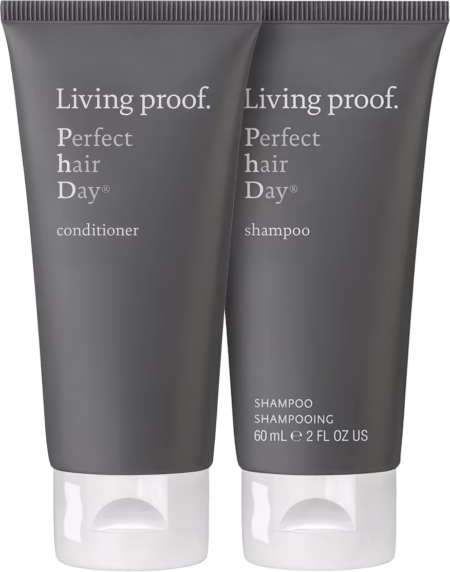 Kit com shampoo e condicionador para todos os tipos de cabelo Living Proof Perfect hair Day PhD Mini Duo proporciona hidratação, brilho e maciez.