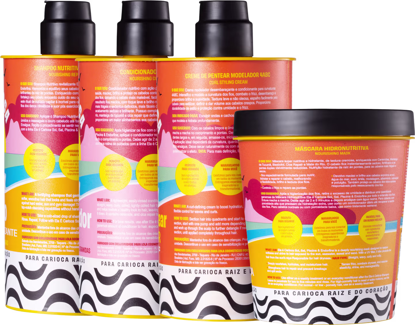 Kit Lola Cosmetics Ela é Carioca Sol, Sal, Piscina & Endorfina Hidronutritiva + 4ABC traz produtos que proporcionam mais definição aos cachos e alinhamento aos fios lisos, Tudo isso com acabamento brilhante, hidratação e muita maciez aos cabelos.
