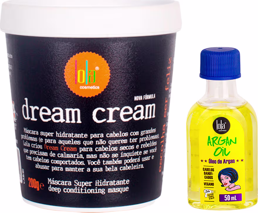 Kit reconstrutor de cabelos danificados com óleo de argan e máscara de hidratação profunda. Lola From Rio Argan Oil + Dream Cream nutre, controla frizz e protege contra danos térmicos, direcionado para cabelos danificados, com sinais de ressecamento, quebra e falta de vitalidade