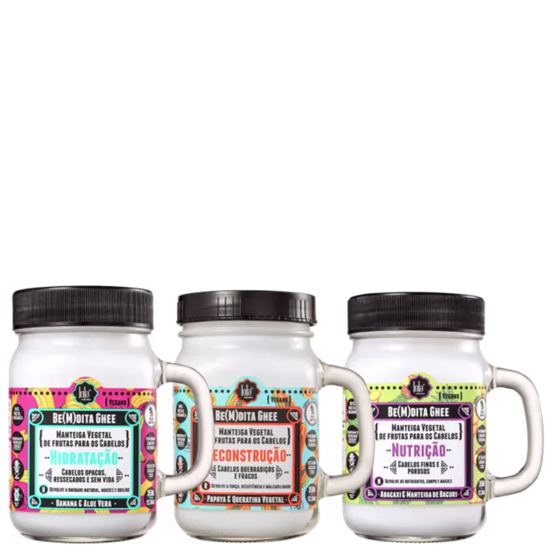 O Kit de Tratamento Capilar Lola From Rio Be(M)dita Ghee traz fórmula à base de manteigas vegetais orgânicas e veganas, o conjunto oferece uma abordagem multifuncional para recuperação capilar. A máscara de Banana proporciona hidratação profunda, restabelecendo a umidade dos fios e devolvendo vitalidade. A máscara de Abacaxi promove nutrição intensa, reequilibrando a estrutura capilar com reposição de nutrientes essenciais. Já a máscara de Mamão atua na reconstrução, resgatando a resistência dos fios e minimizando danos causados por processos químicos e estresse ambiental.