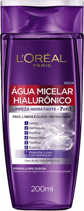 L'Oréal Paris Hialurônico - Água Micelar 200ml: limpa intensamente a pele, ao mesmo tempo que hidrata e previne o aparecimento de linhas de expressão. Além de demaquilar, tonificar, purificar, reequilibrar, e suavizar a pele.
