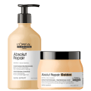 Kit com shampoo e máscara para cabelos danificados em tamanho profissional. L'Oréal Professionnel Absolut Repair Gold Quinoa + Protein Golden Lightweight Dupla ajuda a restaurar os fios sem pesar, além de promover brilho intenso.