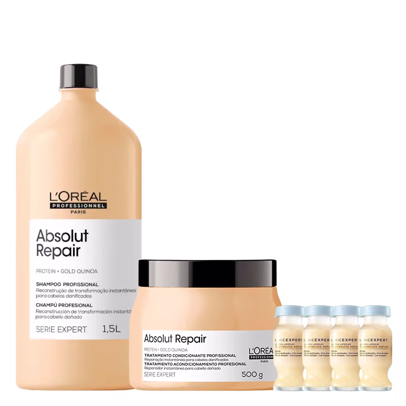 O Kit Loréal Professionnel Absolut Repair Gold Quinoa + Protein Power atua na reparação da fibra capilar extremamente fragilizada para que o cabelo revele uma aparência mais saudável. Seu visual ganha muito mais brilho e um toque macio incrível.
