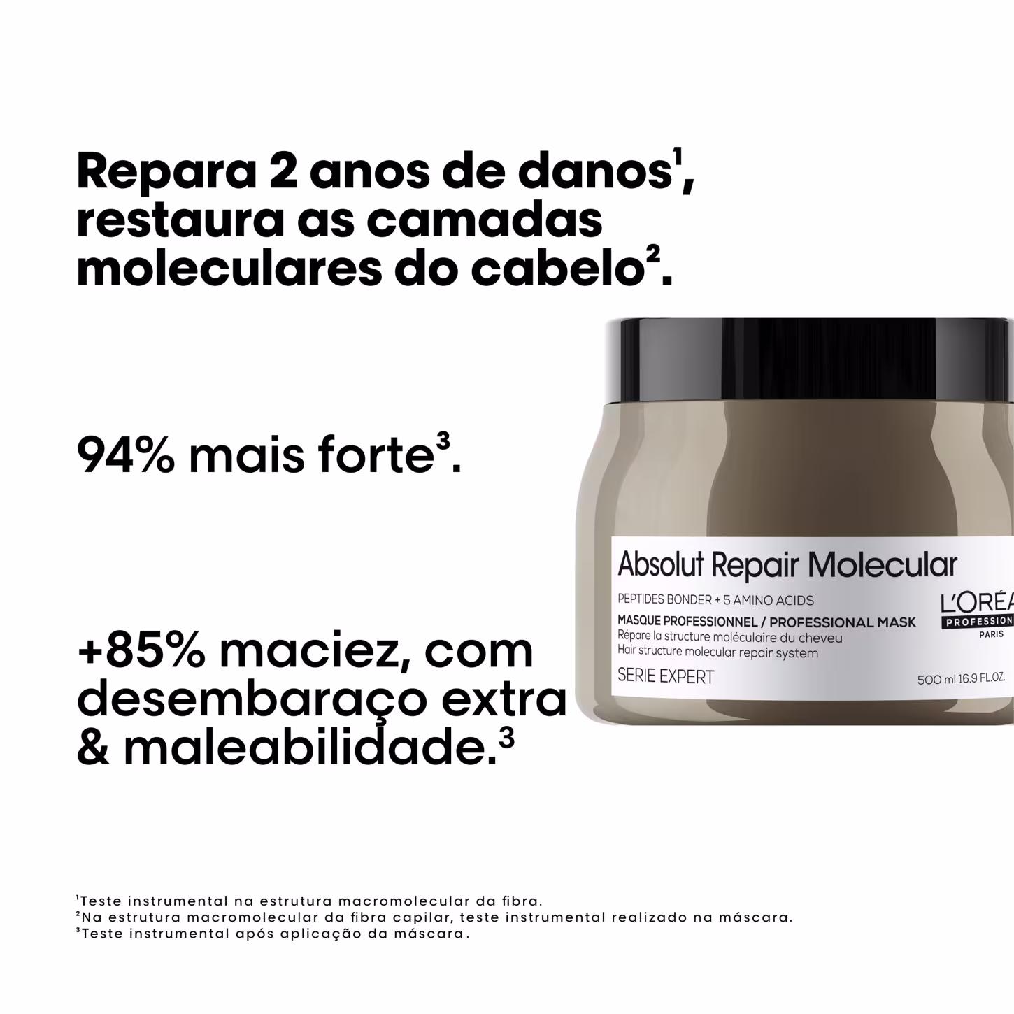 O Kit L'Oréal Professionnel Absolut Repair Molecular Tratamento Super Trio oferece um tratamento profundo: repara os fios intensamente ajudando a reconstruir a estrutura molecular do cabelo e a restaurar a força, elasticidade e movimento, sem deixar uma sensação pesada.