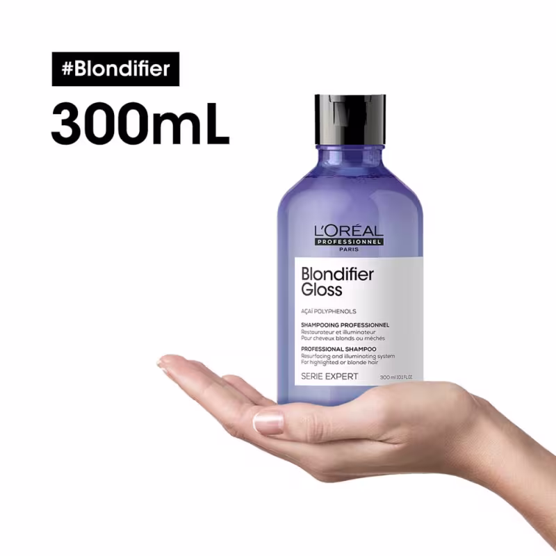 L'Oréal Professionnel Blondifier Gloss - Shampoo 300ml: sua fórmula nutre e aumenta o brilho dos cabelos loiros, deixando os fios saudáveis, limpos e tratados. Ideal para cabelos loiros que precisam de um tom mais brilhoso pois suaviza o cabelo danificado. Por conter Polifenóis presentes no Açaí, proporciona um tratamento intenso e ideal para loiras.