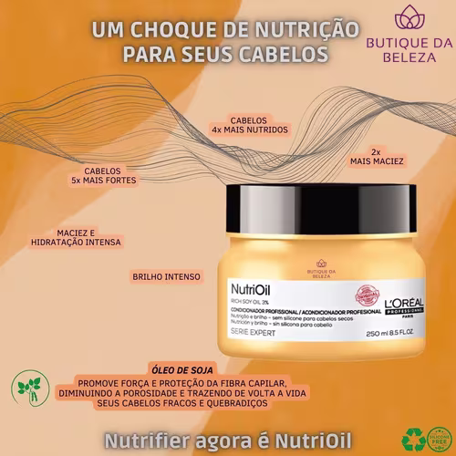 L'Oréal Professionnel Expert NutriOil - Máscara Capilar 250g: oferece fórmula enriquecida com óleo de coco com uma textura leve que confere a dose certa de nutrição. Os cabelos se transformam instantaneamente em 5x mais fortes, 2x mais sedosos e brilhantes.