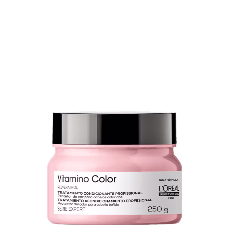 L'Oréal Professionnel Serie Expert Vitamino Color - Máscara Capilar 250g: promove proteção até das cores mais sensíveis, hidratação e luminosidade para os fios. Seu principal ingrediente, o Resveratrol, é um poderoso antioxidante presente na casca e nas sementes das uvas, que tem a função de preservar a cor dos cabelos por mais tempo. O resultado é um cabelo com 8 semanas de proteção da cor e 7x mais brilho.
