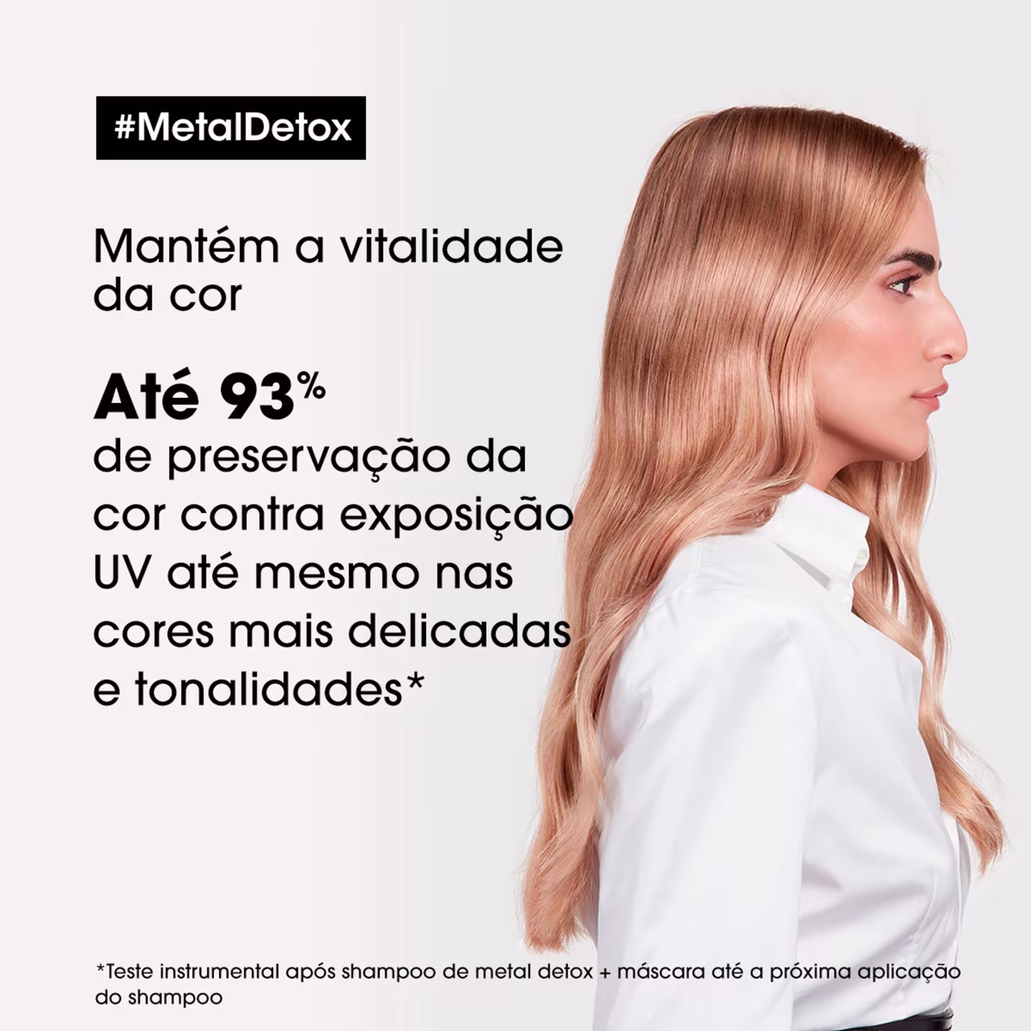 L'Oréal Professionnel Metal Detox - Máscara Capilar 500ml: esse tratamento traz cosmeticidade aos fios, selando as cutículas e protege a fibra de depósitos de partículas após qualquer serviço de cor, mechas ou descoloração.