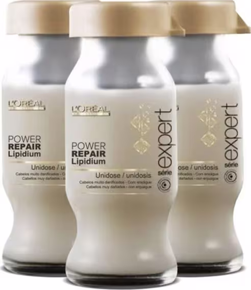 Não sei o CEPKit com ampolas capilares para cabelos danificados. L'Oréal Professionnel Power Repair Lipidium Triple atua profundamente nos fios, com recuperação completa.