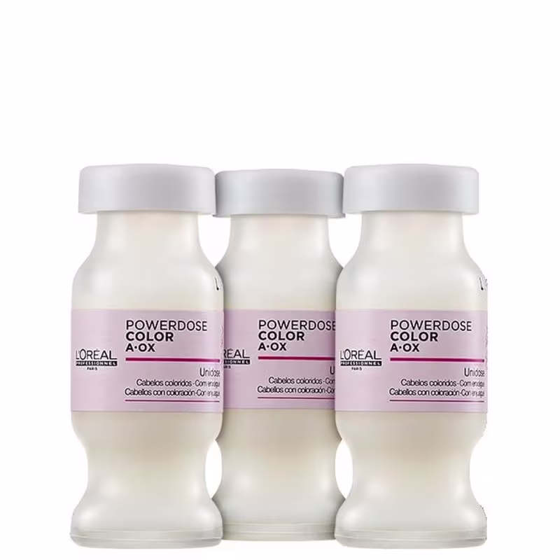 Não sei o CEPKit com ampolas capilares para cabelos coloridos. L'Oréal Professionnel Powerdose Color A. OX Triple garante tons vibrantes, com fios macios.