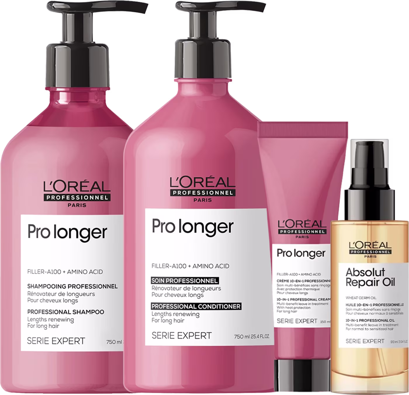 Kit com shampoo, condicionador, leave-in e óleo para cabelos finos em tamanho profissional. L'Oréal Professionnel Pro Longer + Absolut Repair Profissional possui ação antifrizz, devolvendo a maleabilidade dos fios.