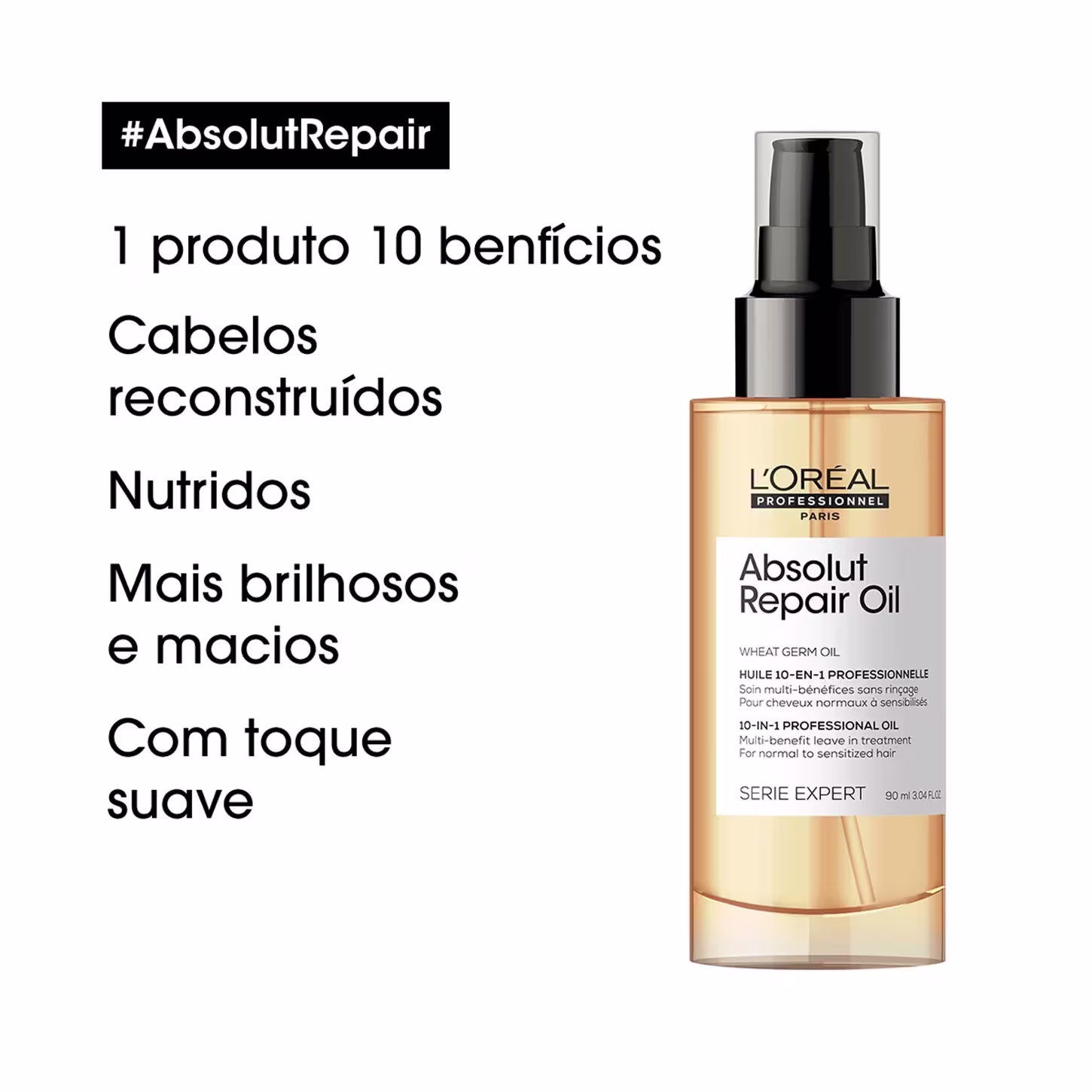 L'Oréal Professionnel Serie Expert Absolut Repair Gold Quinoa 10in1 - Óleo Reparador 90ml: sua fórmula proporciona 10 benefícios, com resultado de fios nutridos, brilhantes e leves, com toque suave.