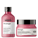 Kit com shampoo e máscara para cabelos longos com pontas afinadas ou danificadas. L'Oréal Professionnel Pro Longer Duplo devolve a densidade dos fios, penetrando e preenchendo a fibra capilar para proteger e fortalecer.