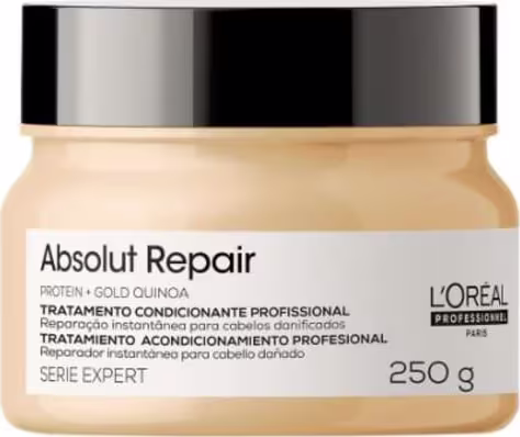 L'Oréal Professionnel Serie Expert Absolut Repair Golden - Máscara Capilar 250g: atua na reparação da fibra capilar para que o cabelo revele uma aparência mais saudável. Sua textura inovadora permite unir o poder de tratamento dos ativos com a leveza de um gel, e as partículas douradas conferem brilho intenso aos fios. Assim, a máscara é ideal para quem precisa tratar, mas não gosta da sensação de peso do pós-tratamento.