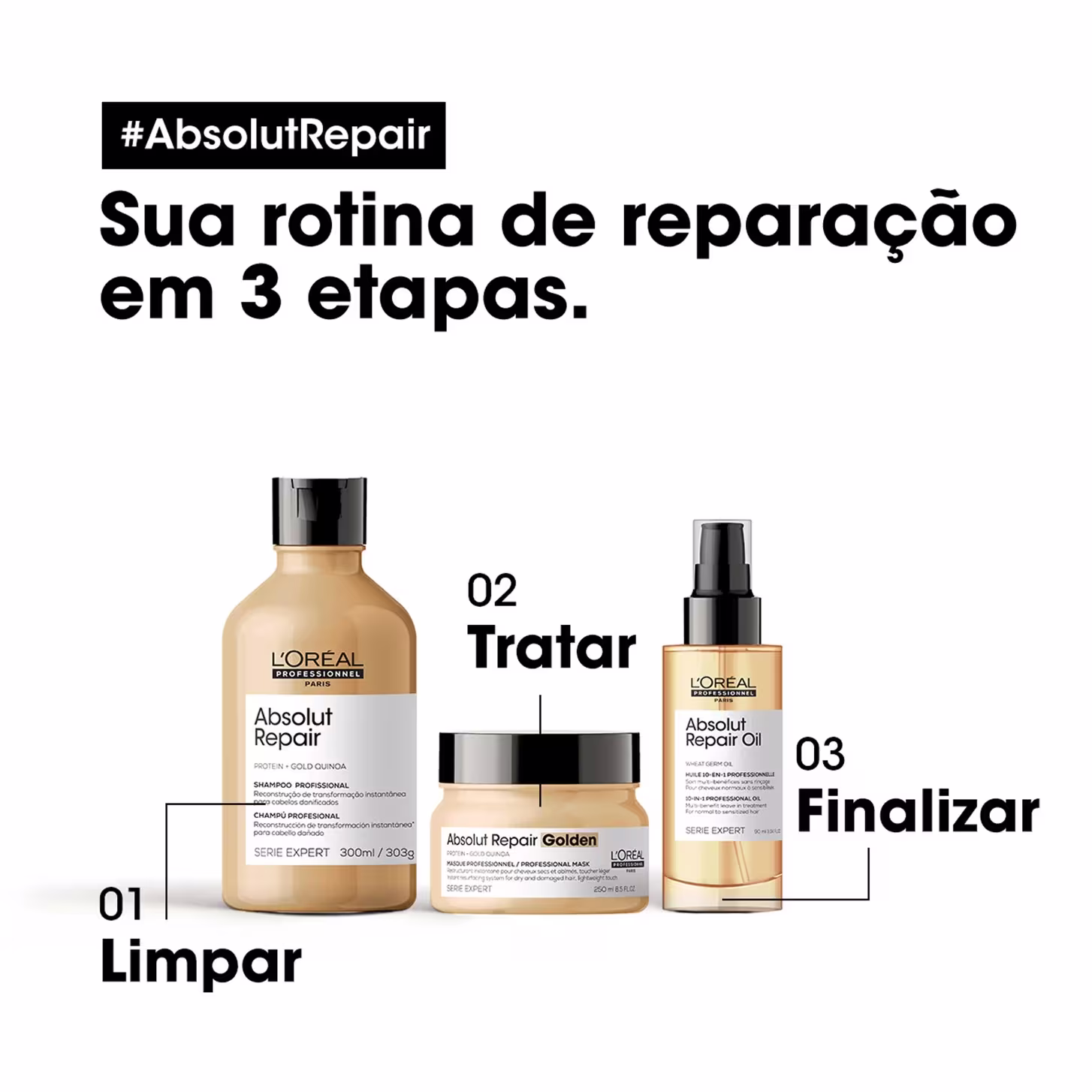 O Kit L'Oréal Professionnel Serie Expert Absolut Repair Oil Intense confere brilho e leveza, na sua rotina de haircare. Atua na reparação da fibra capilar fragilizada e, graças a seus principais ingredientes, a Quinoa Dourada e Proteína Hidrolisada ,os ativos penetram mais profundamente na fibra, para uma selagem e reestruturação definitiva.