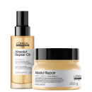 Kit com máscara e óleo capilar. L'Oréal Professionnel Serie Expert Absolut Repair Omega-9 + Protein Dupla conta com Quinoa Dourada e Trigo, devolve a nutrição e o brilho.