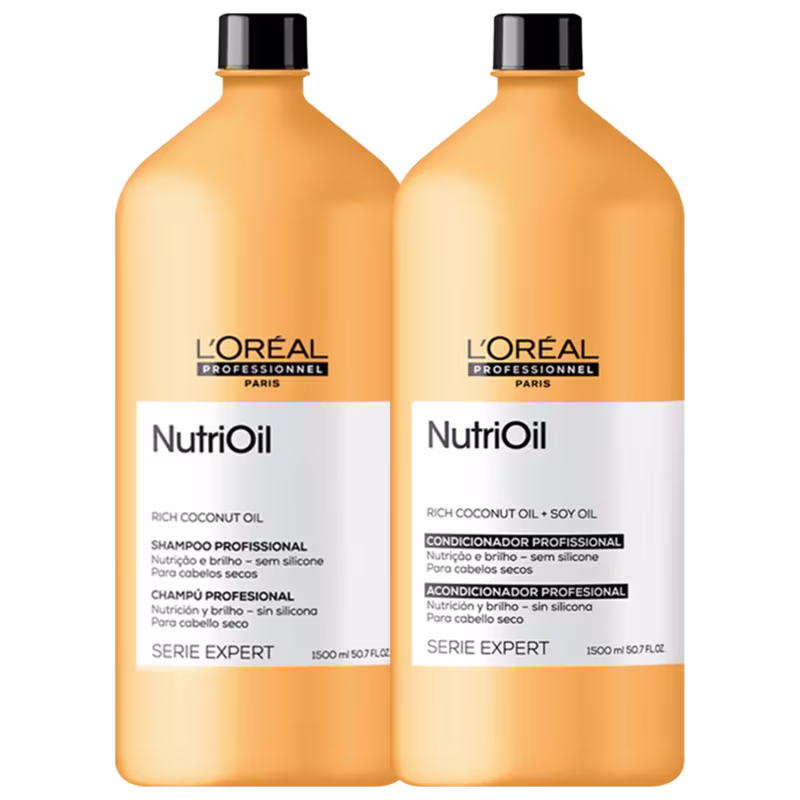 Kit com shampoo e condicionador para cabelos ressecados e sem brilho. L'Oréal Professionnel Serie Expert NutriOil Super Duo promove nutrição, brilho e maciez.