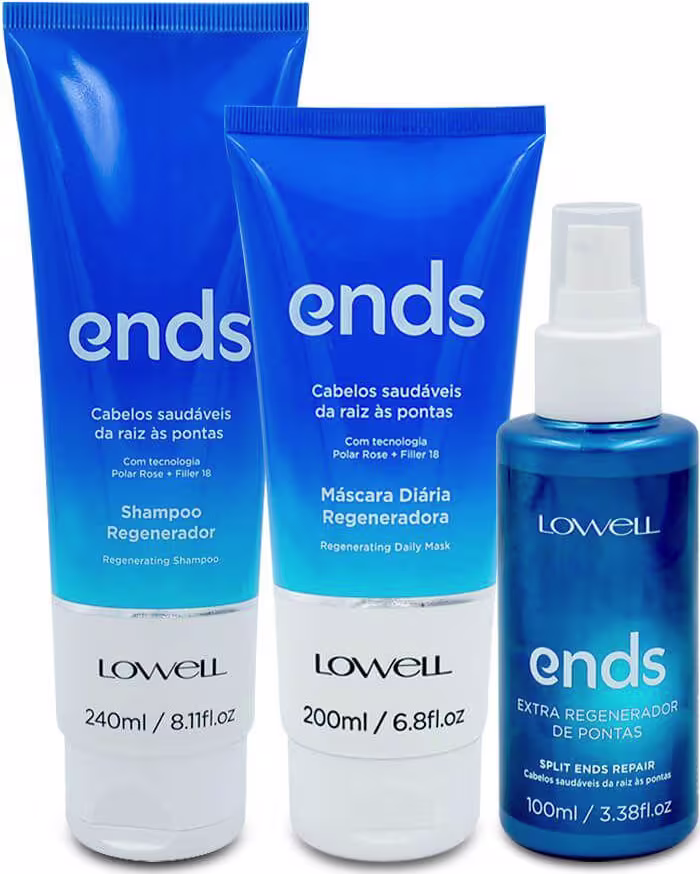 Kit com shampoo, máscara e leave-in para cabelos danificados. Lowell Ends garante fios longos e cheios de vida, além de acabar com a quebra e a formação de pontas duplas.