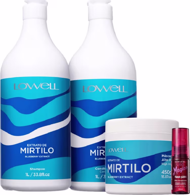Não sei o CEPKit de tratamento para todos os tipos de cabelo. Lowell Extrato de Mirtilo Salon Mágico Disciplinante devolve a vitalidade dos fios, deixando-os macios e com brilho.