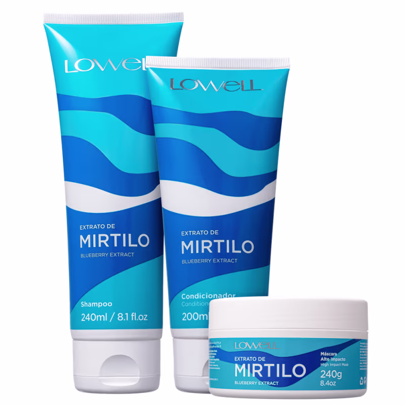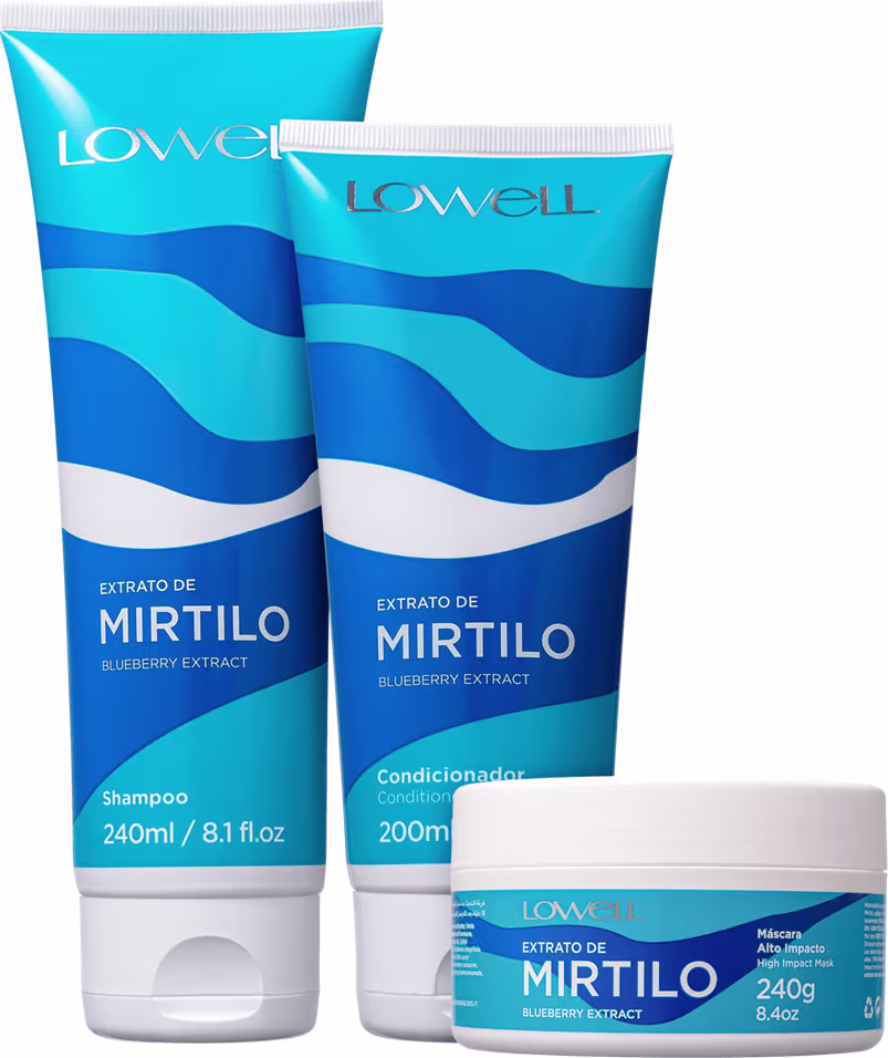 Kit com shampoo, condicionador e máscara para cabelos equilibrados. Lowell Extrato de Mirtilo Triplo nutre, disciplina e devolve a vitalidade dos fios durante a lavagem.