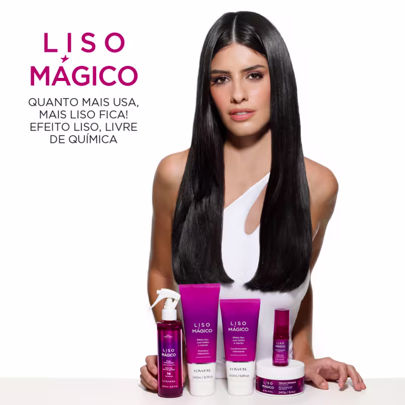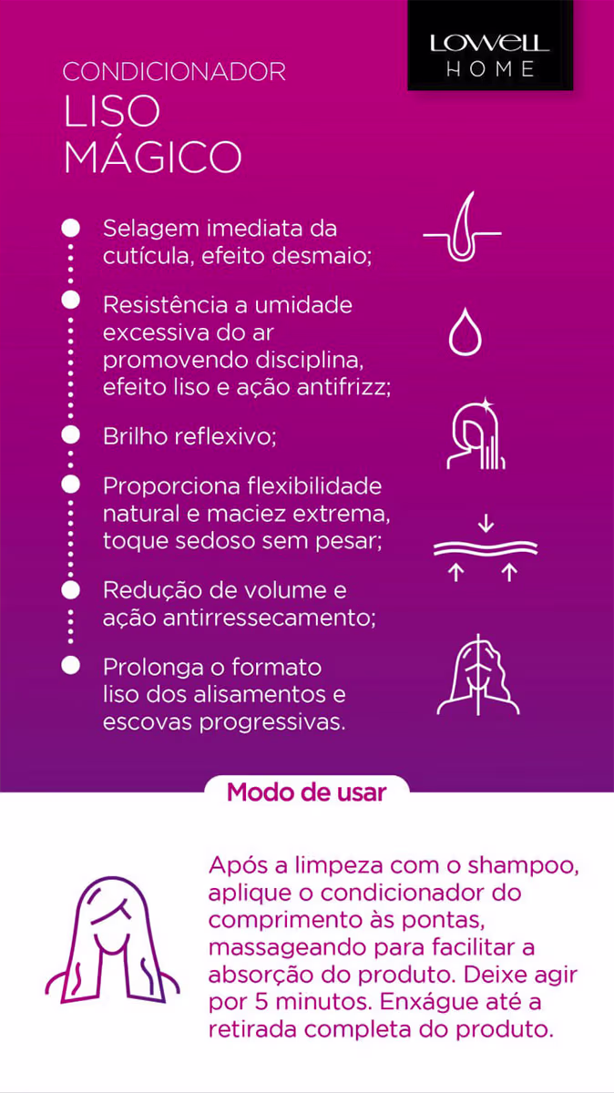 O Kit Lowell Liso Mágico promove o efeito Liso temporário e o alinhamento das cutículas, além de proporcionar 14 benefícios Mágicos em um único produto, como proteção do frizz e dos danos causados pelo calor, bloqueio da umidade, selagem das cutículas, reparação das pontas duplas e muito mais.