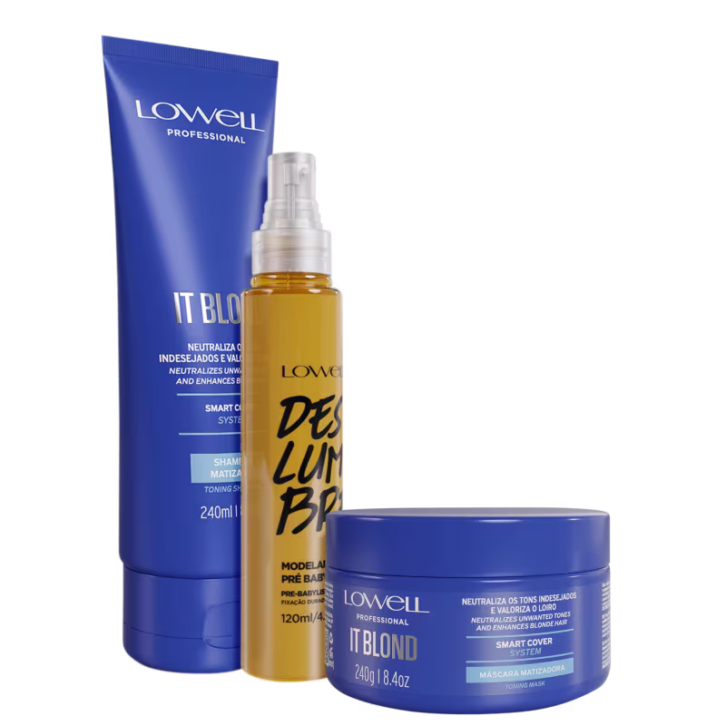 Não sei o CEPKit com shampoo, máscara e spray antiquebra para cabelos loiros ou grisalhos. Lowell Violet Platinum Deslumbre Antiquebra Trio fortalece e matiza os fios.