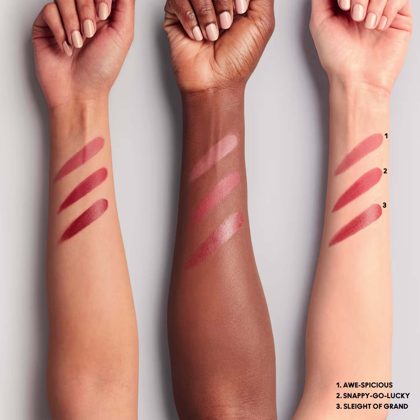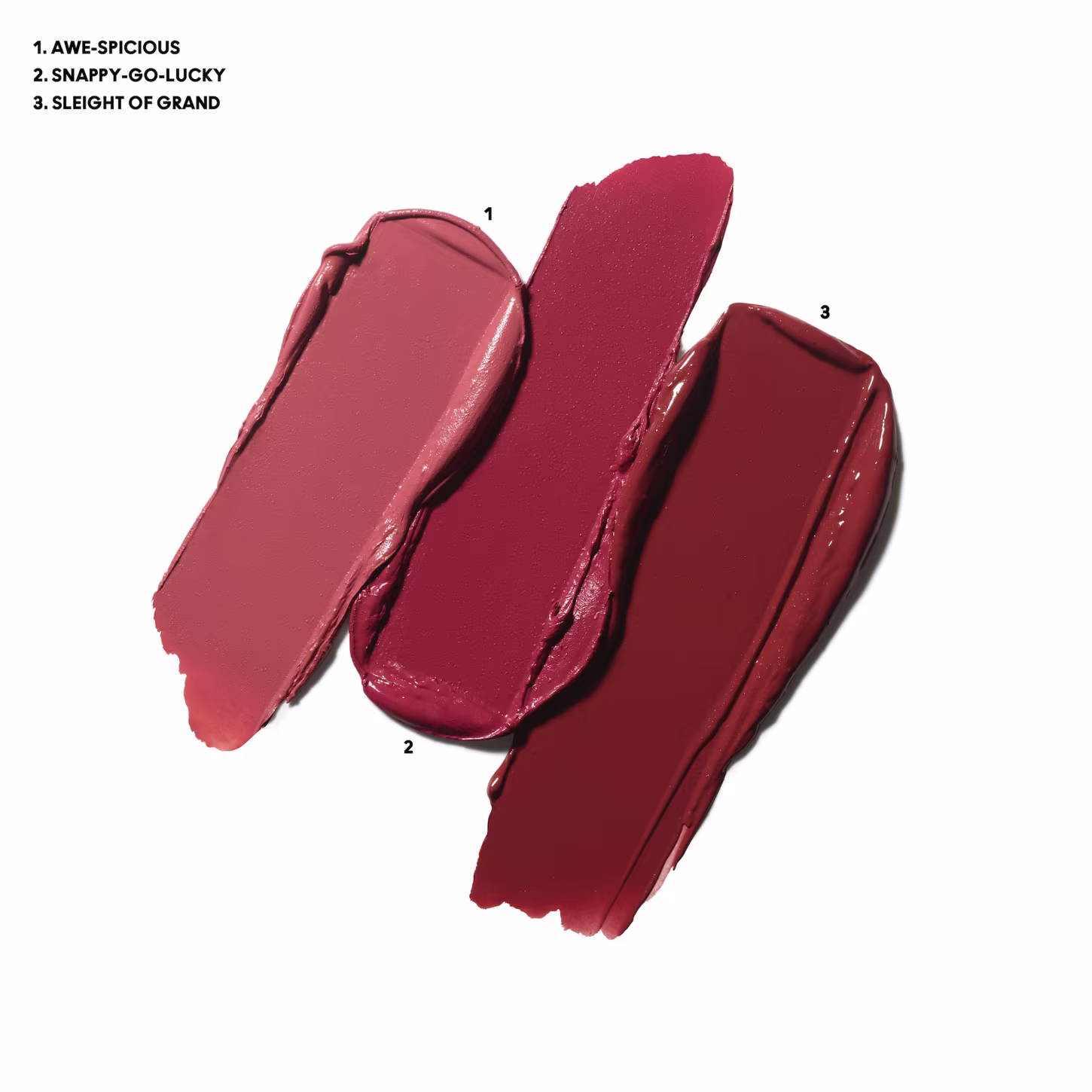 Kit com três batons em bala em tons neutros. Com o Kit M·A·C Hypnotizing Holiday Tiny Tricks Mini Lipstick Trio Neutral transforme instantaneamente seu look de fim de ano com uma coleção de cores ousadas que mudam de tom, feito como mágica bem na frente de seus olhos..