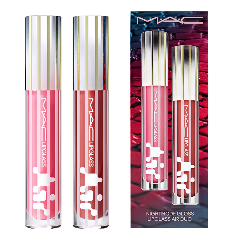 Kit com glosses labiais. M·A·C Lipglass Air Non-Sticky Gloss promove hidratação por 8h e efeito volumoso em duas cores exclusivas.