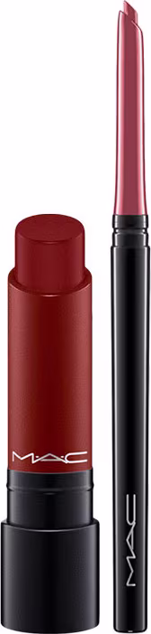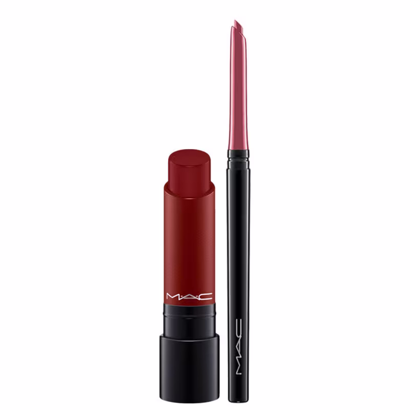Kit de maquiagem com batom cremoso e lápis de boca. Kit M·A·C Liptensity Dionysus é rico em pigmentos e, assim, colore os lábios de forma intensa. A tonalidade vermelha fechada é sofisticada e marcante.