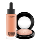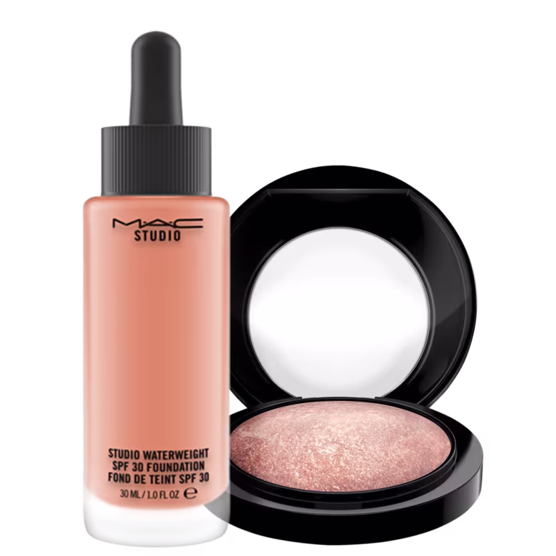 Kit com base líquida e iluminador em pó. Kit M·A·C Mineralize Studio Waterweight NW35 deixa a pele uniforme e radiante com cobertura leve, controle da oleosidade e brilho dimensional.
