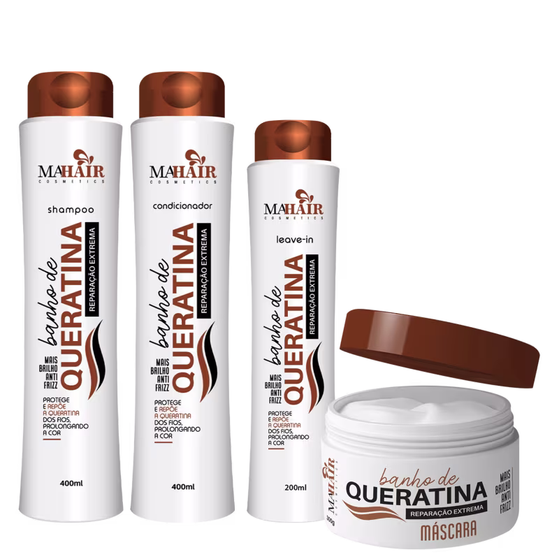 Kit completo para cuidados com os cabelos danificados. Mahair Banho de Queratina favorece o crescimento e garante vitalidade e brilho aos fios.