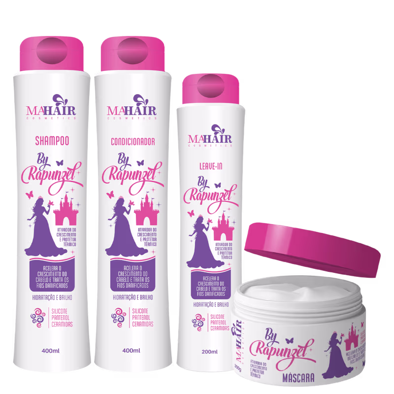 Kit completo para cuidados com os cabelos. Mahair By Rapunzel hidrata e fortalece seus cabelos, promovendo crescimento saudável dos fios.