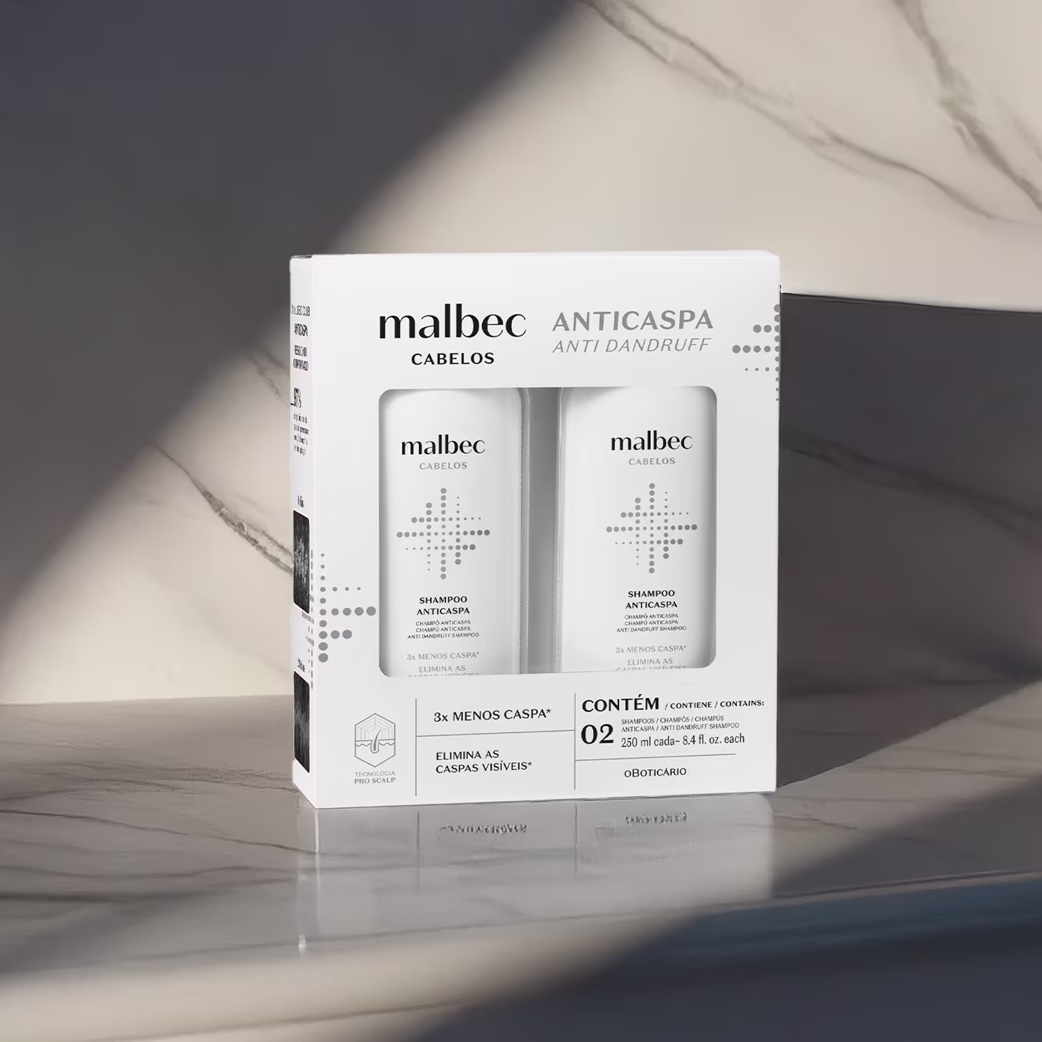 Malbec Cabelos o Boticário - Shampoo Anticaspa 2x250ml: une ciência e tecnologia para entregar um couro cabeludo saudável e com 3x menos caspa, com um ótimo custo-benefício. Garantindo limpeza profunda e cuidados, atua no combate contra a caspa.